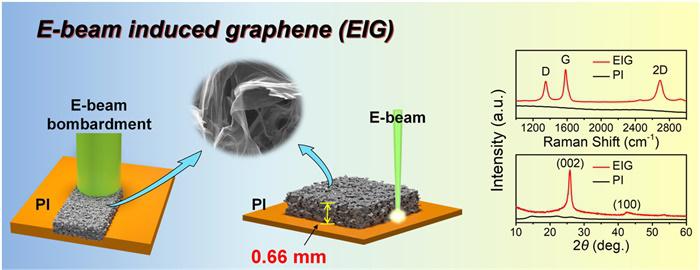 中科院合肥研究院固體物理研究所王振洋研究員課題組首次通過(guò)高能電子束在聚酰亞胺上的誘導(dǎo),直接合成三維石墨烯。由于高動(dòng)能和低反射的特點(diǎn),電子束的能量很容易被吸收,導(dǎo)致 聚酰亞胺的碳化,形成具有豐富的三維孔隙結(jié)構(gòu)和理想導(dǎo)電性的宏觀厚石墨烯薄膜(0.66 毫米)。